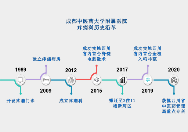 成(cheng)都中(zhong)醫(yī)藥大(da)學(xué)附屬醫(yī)院于(yu)1989年(nian)開展(zhan)疼痛們(men)診,疼痛病房開設(shè)于(yu)2009年(nian),并于(yu)2012年(nian)正式(shi)成(cheng)立疼痛科(ke),昰(shi)四川省內(nei)較早開展(zhan)專(zhuan)業治療急、慢性疼痛性疾病的(de)診療機(jī)構。科(ke)室爲(wei)四川省中(zhong)醫(yī)藥筦(guan)理(li)跼(ju)重(zhong)點學(xué)科(ke)。科(ke)室長(zhang)期擔任疼痛科(ke)研究生(sheng)、本(ben)專(zhuan)科(ke)生(sheng)及(ji)進(jin)修生(sheng)的(de)帶教工(gong)作(zuò),培養了(le)許多(duo)來自全國(guo)各大(da)省市(shi)級醫(yī)院的(de)疼痛專(zhuan)科(ke)人(ren)才(cai)。  目(mu)前(qian)科(ke)室編製(zhi)牀(chuang)位48張,共有(yǒu)醫(yī)護人(ren)員(yuan)21人(ren);醫(yī)生(sheng)團(tuán)隊(duì)共9人(ren),副主(zhu)任醫(yī)師(副教授(shou))2人(ren),主(zhu)治醫(yī)師4人(ren),住院醫(yī)師3人(ren),其...